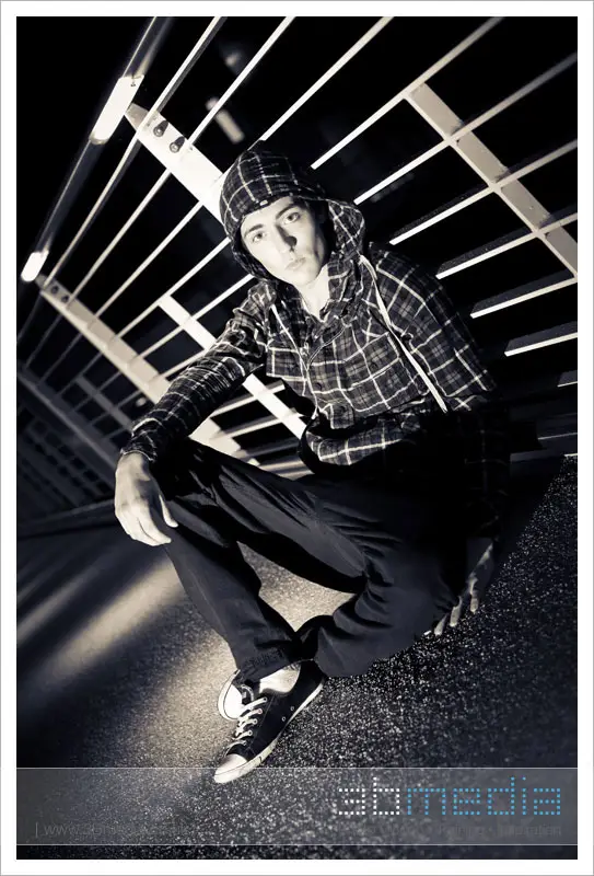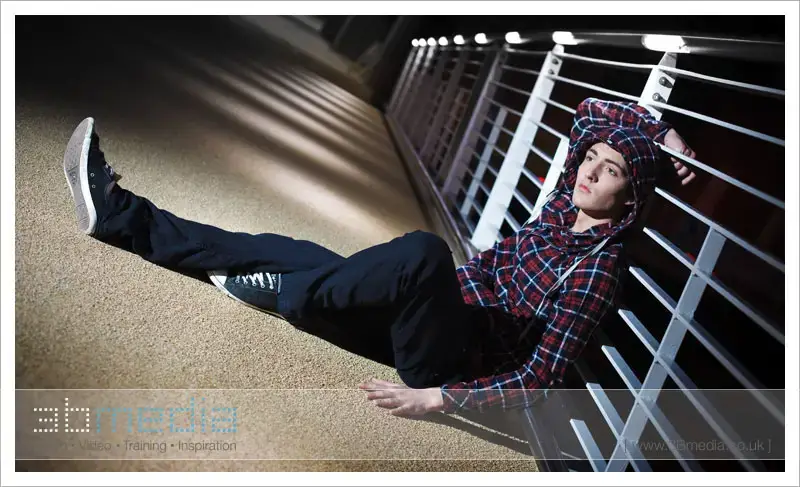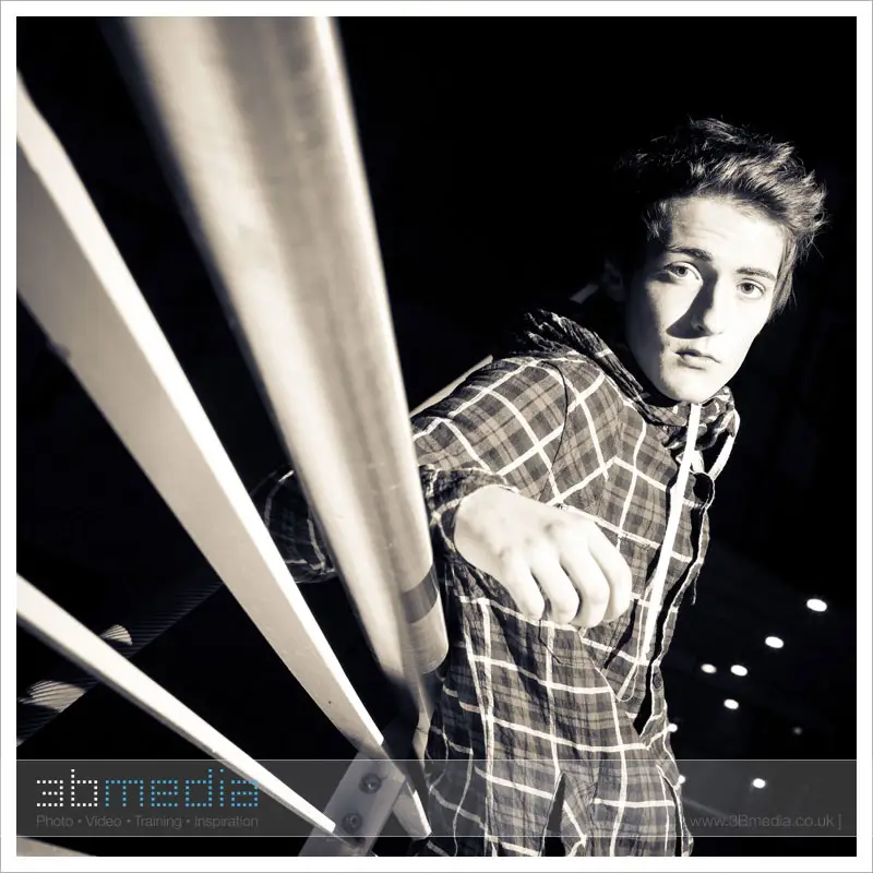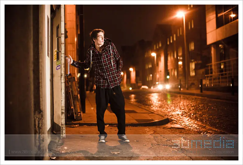 We ventured onto Leeds’ backstreets and I attempted to make a movie-esque shot of Alex, with Mr Booker holding the flash to camera right.