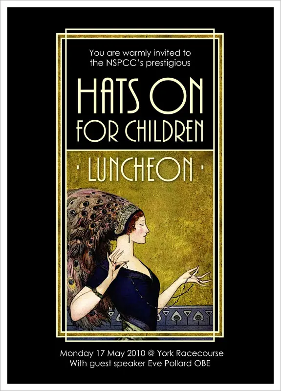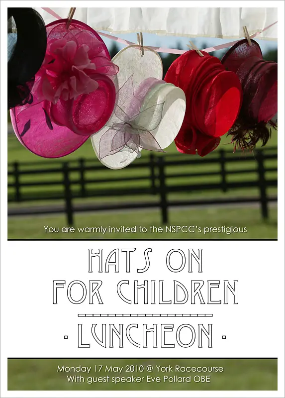 I’ve a pal who works for the NSPCC (National Society for the Prevention of Cruelty to Children) charity and she recently asked me if I’d be willing to do a bit of graphic design for their next swanky Hats On event at York Races.