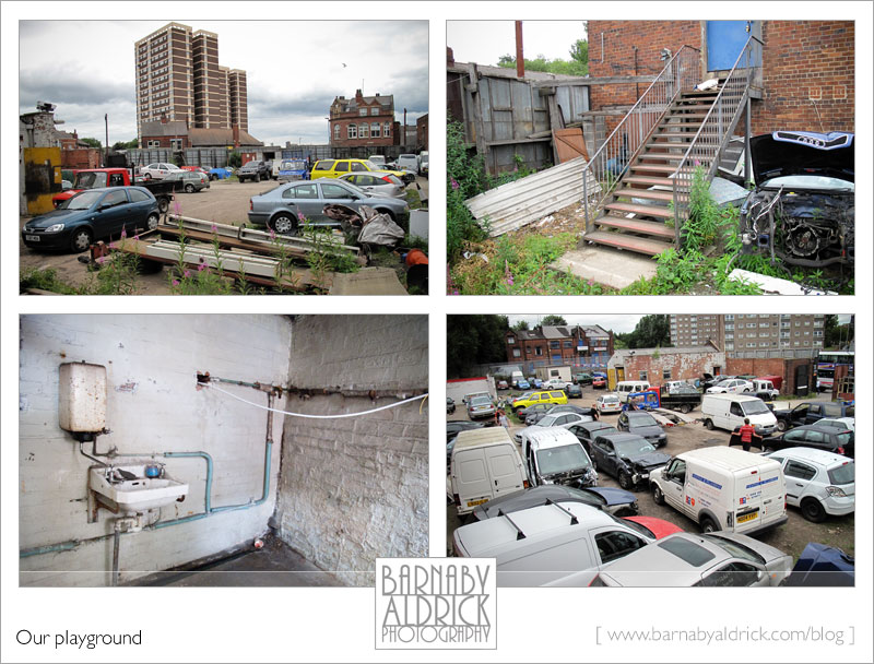 So we had a think. I’d literally just met and photographed Andy & his business partners (above) for a Leeds Guide night life feature. They run a club in a massive warehouse on Water Lane called Kerbcrawler. I popped back in on the way back to the car to ask Andy if he’d mind if we possibly came to do a flash day sometime. He mentioned he had a mill / knackers yard / mechanics / recording studio over in Wortley that might be more suitable. So a week later I went for a peep (below) and the place was ace. Loads of weathered knooks & crannies, and a bunch of storage rooms full of all sorts of cool junk.
