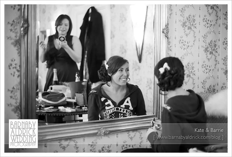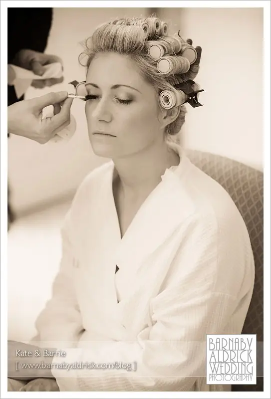 Kate & Barrie Hazlewood Castle Winter Wedding Photography by Barnaby AldrickHere’s the beautiful Kate, being made up in her ‘Bride’ dressing gown! We spent the morning photographing the girls preparations.