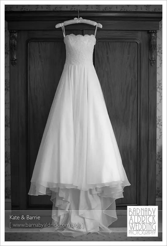 Kate & Barrie Hazlewood Castle Winter Wedding Photography by Barnaby AldrickKate’s gorgeous dress.  It had it’s very own spangly ‘congratulations it’s your wedding’ banner round it’s waist it when we arrived.