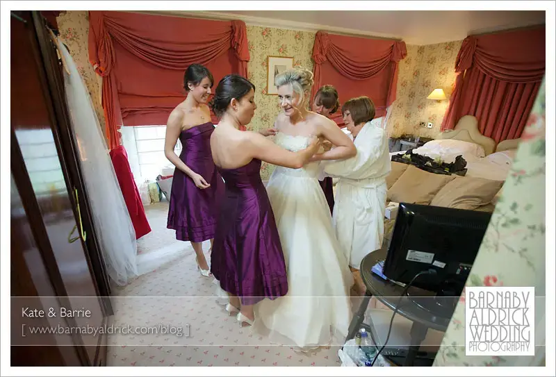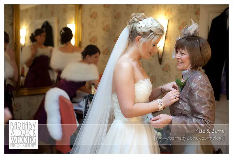 Kate & Barrie Hazlewood Castle Winter Wedding Photography by Barnaby AldrickI always try to catch moments during the preps, and love this one of Kate fixing her mum’s buttonhole while the girls wrap up in the background