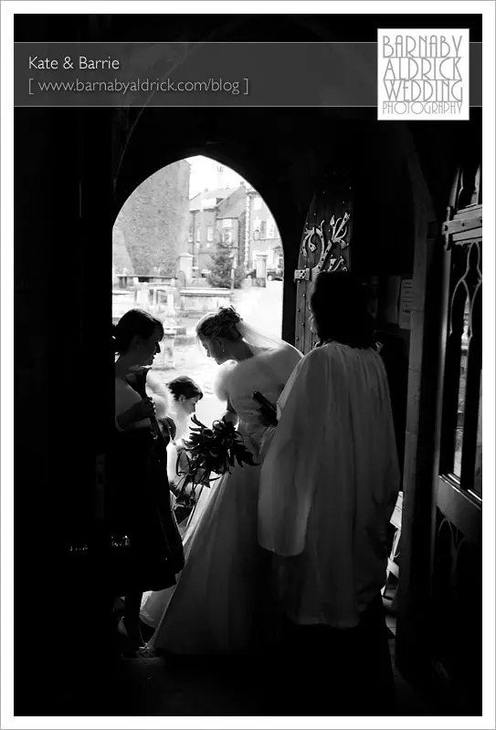 Kate & Barrie Hazlewood Castle Winter Wedding Photography by Barnaby AldrickWhile I nipped down to the front of the church Clare caught this silhouette of Kate and the girls at the door.