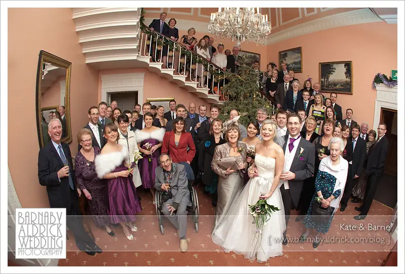 Kate & Barrie Hazlewood Castle Winter Wedding Photography by Barnaby AldrickThe rest of the groups were done inside, and I like this fun fisheye shot of everyone