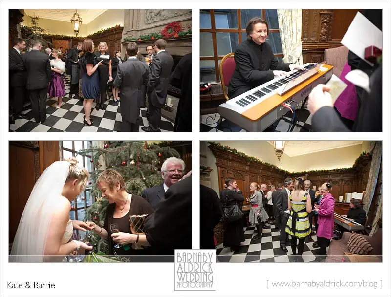 Kate & Barrie Hazlewood Castle Winter Wedding Photography by Barnaby AldrickChampagne reception milling! Kate’s funny – she told me she’d booked myself and the pianist, Eugene, just because we’ve got cool names!