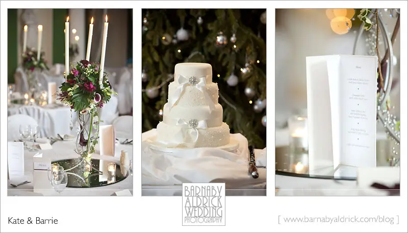Kate & Barrie Hazlewood Castle Winter Wedding Photography by Barnaby AldrickA few details of the flora, cake & menu.  I like the fact that Hazlewood give you a sword to cut the cake!