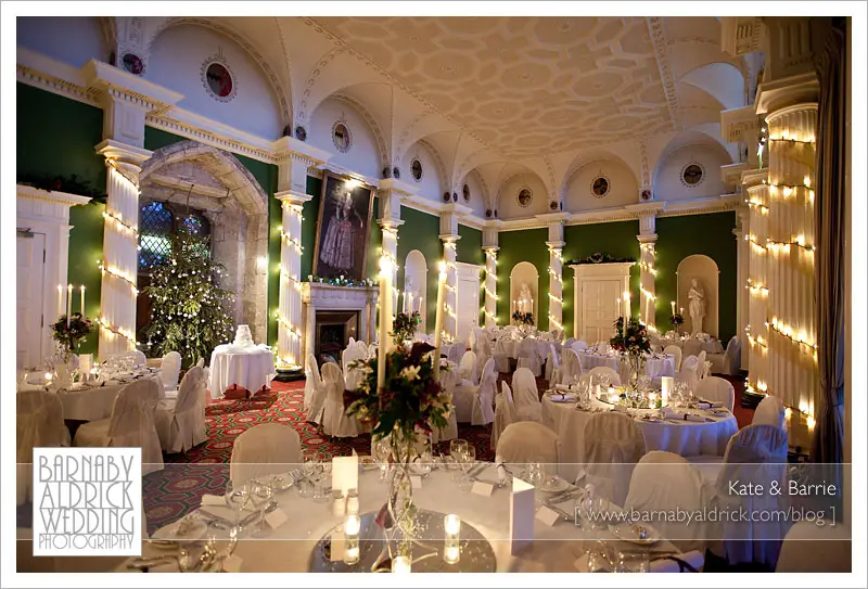 Kate & Barrie Hazlewood Castle Winter Wedding Photography by Barnaby AldrickThe Great Hall looked splendid, bedecked with candles & fairylights.