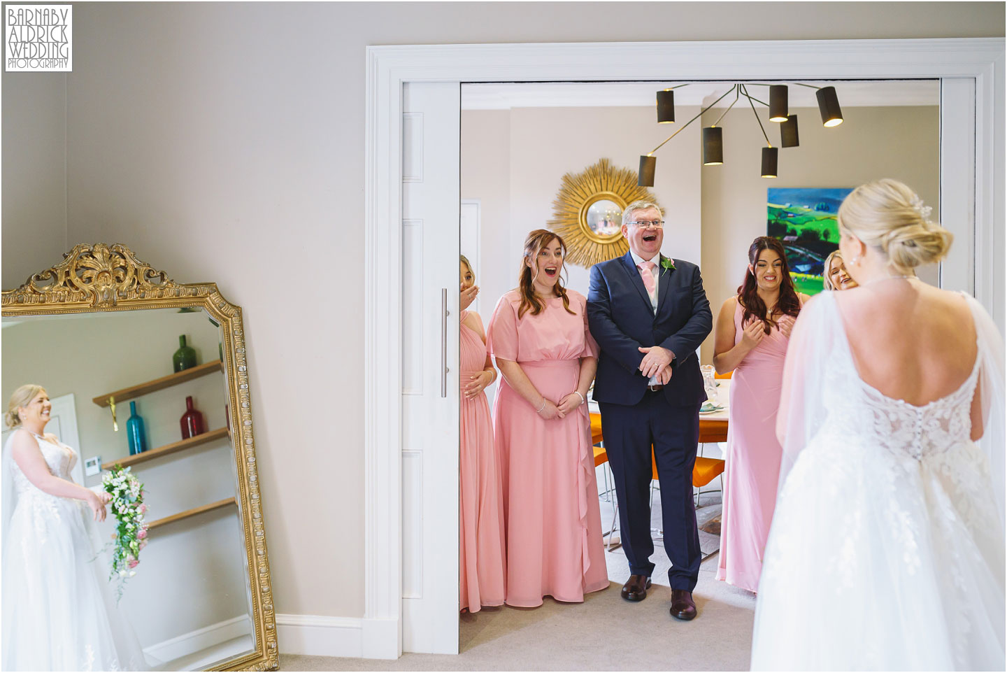 We were blessed with another blazing Yorkshire summer’s day, as I joined Laura and team bride in the Russell Room at Rudding Park, being pampered and enjoying glasses of fizz! Vibes were relaxed, as gifts were opened, dresses taken from their bags and hung and Jimmy Choo’s taken out of their expensive protective socks! As I was shooting this one solo, I nipped over to Alex and team Groom for a quick half hours suiting and booting in the funky yellow lounge upstairs in Rudding House. Back to Laura and we were soon in her stunning dress and sliding the door back for the Dad/bridesmaid reveal (and squeal!)