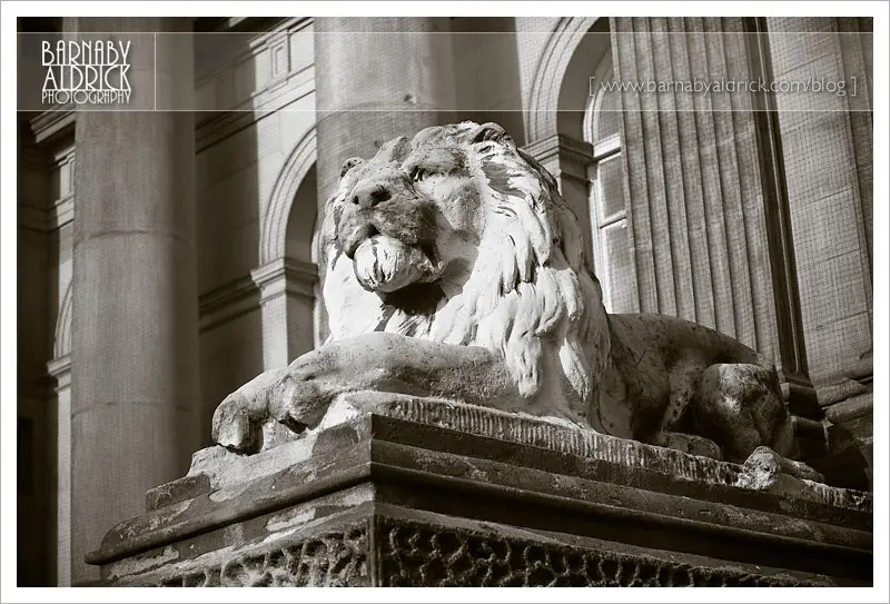 The guardian Lions outside Leeds Town Hall; looking weather beaten, but still proud.