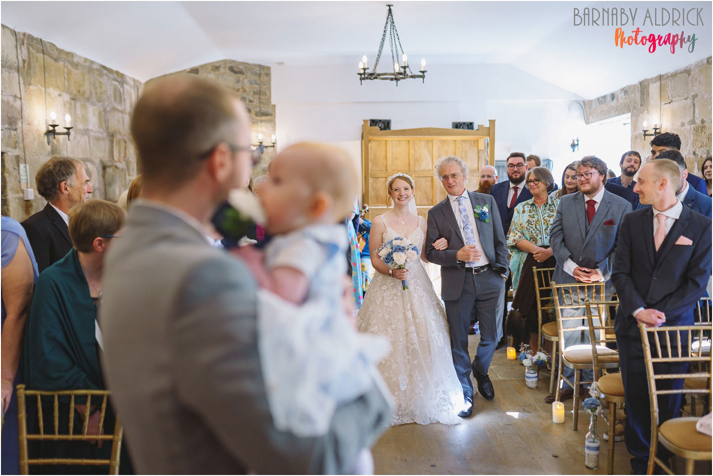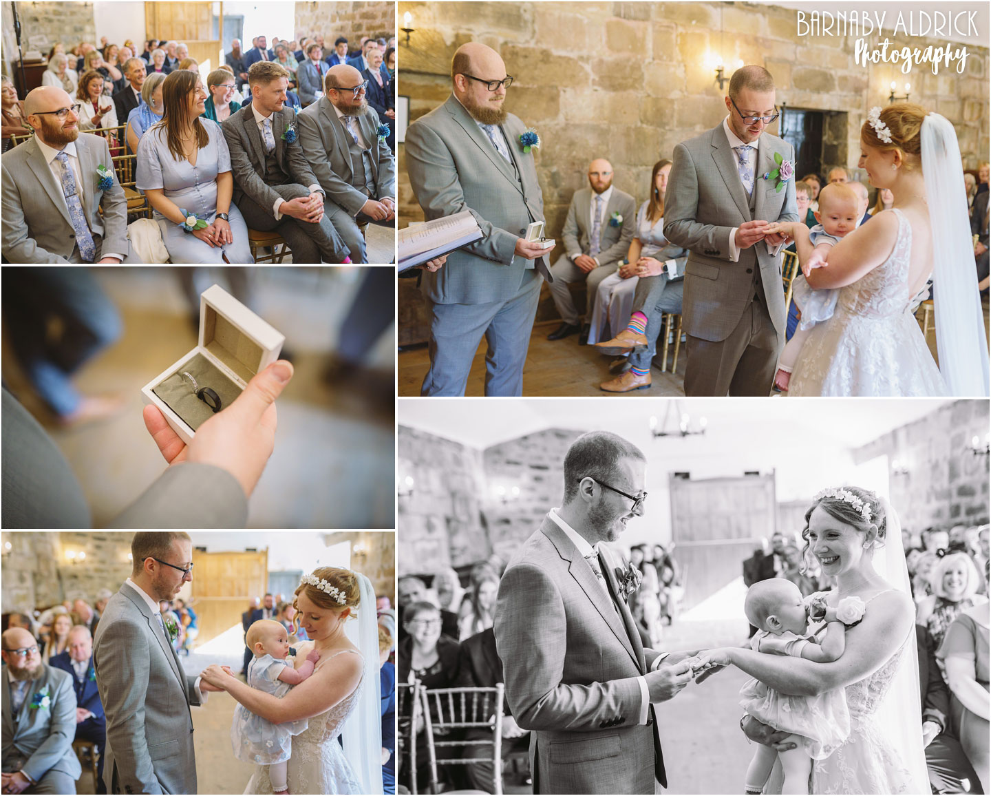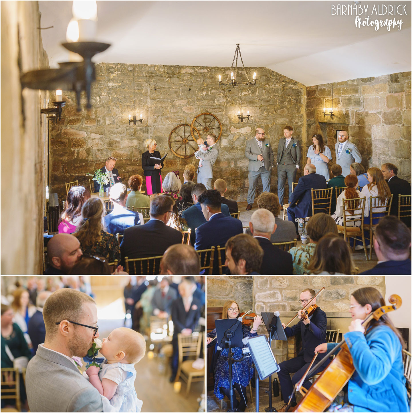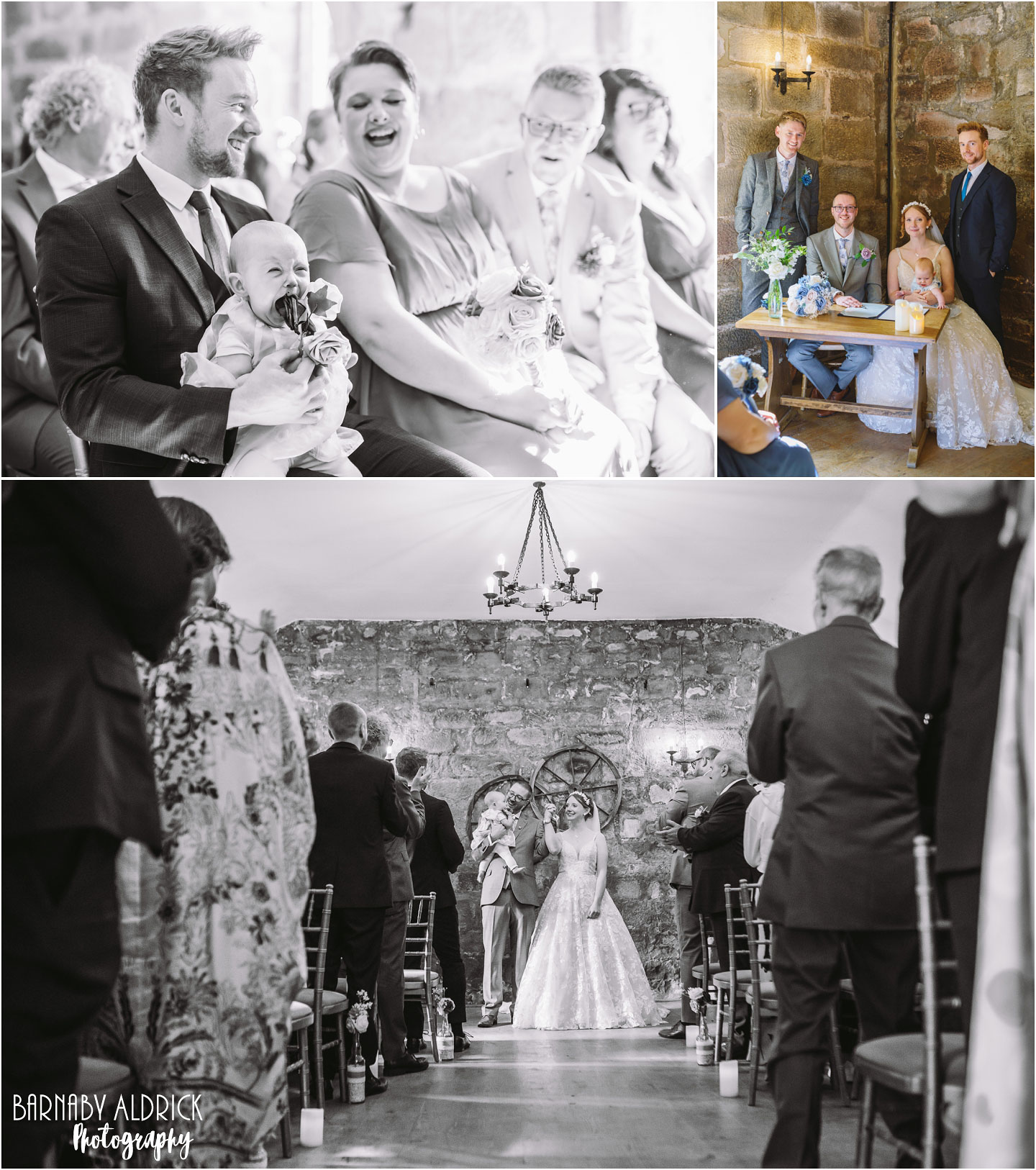 In the morning I skipped between the bridefolk (with a gent of honour) in the house and groomsfolk (also starring a lady person of honour) in the Threshing Barn – and very much enjoyed the banter at each! Their ceremony upstairs in The Courtroom was super charming, literally passing the baby to pop rings on one another, before processing out to a string rendition of the Jurassic Park theme!