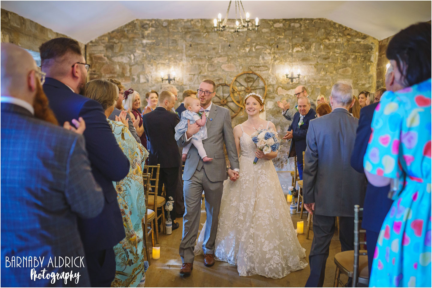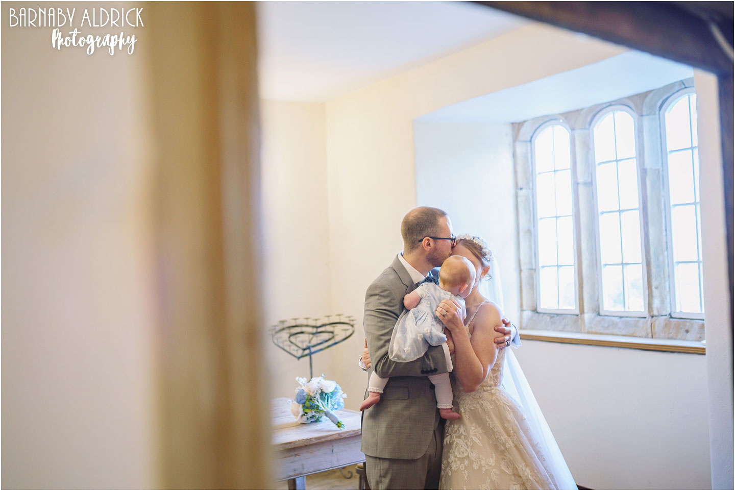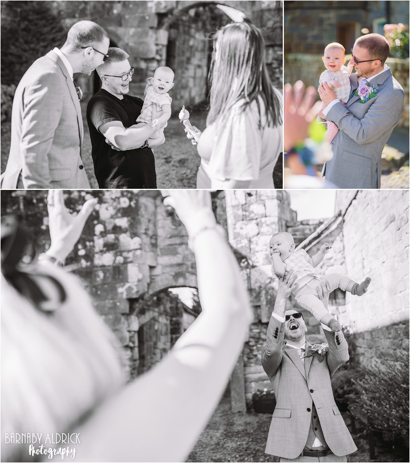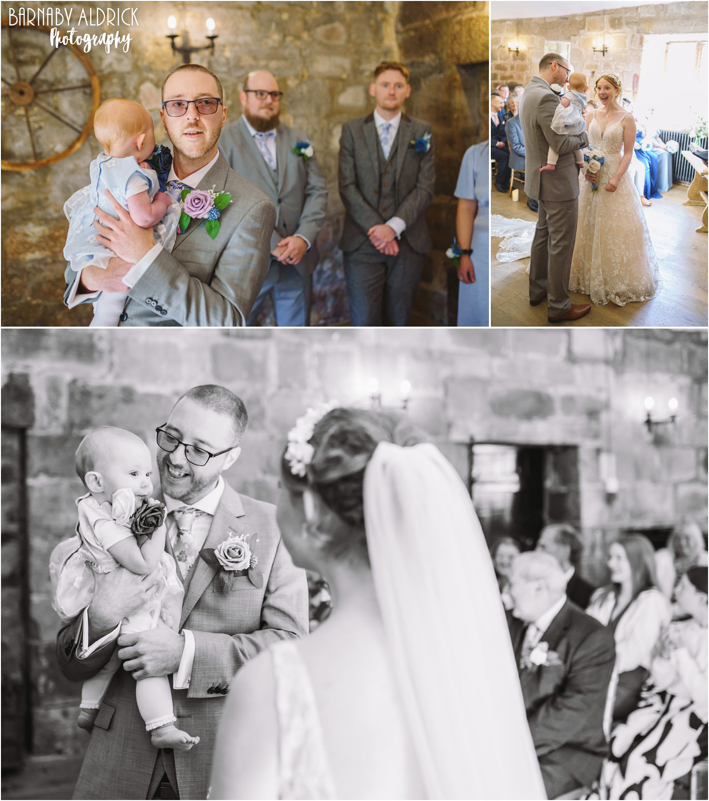 In the morning I skipped between the bridefolk (with a gent of honour) in the house and groomsfolk (also starring a lady person of honour) in the Threshing Barn – and very much enjoyed the banter at each! Their ceremony upstairs in The Courtroom was super charming, literally passing the baby to pop rings on one another, before processing out to a string rendition of the Jurassic Park theme!