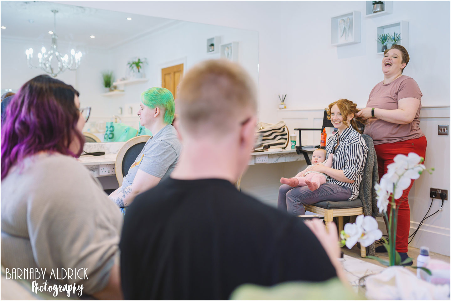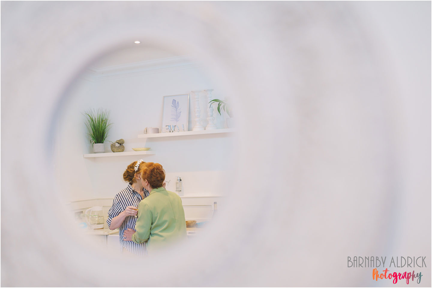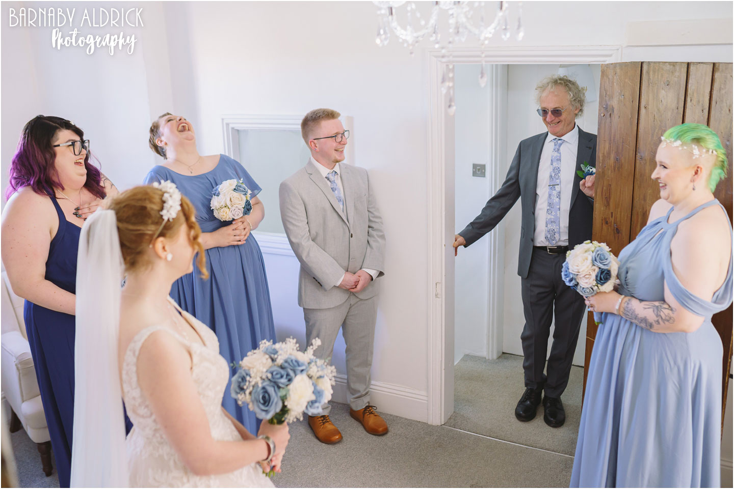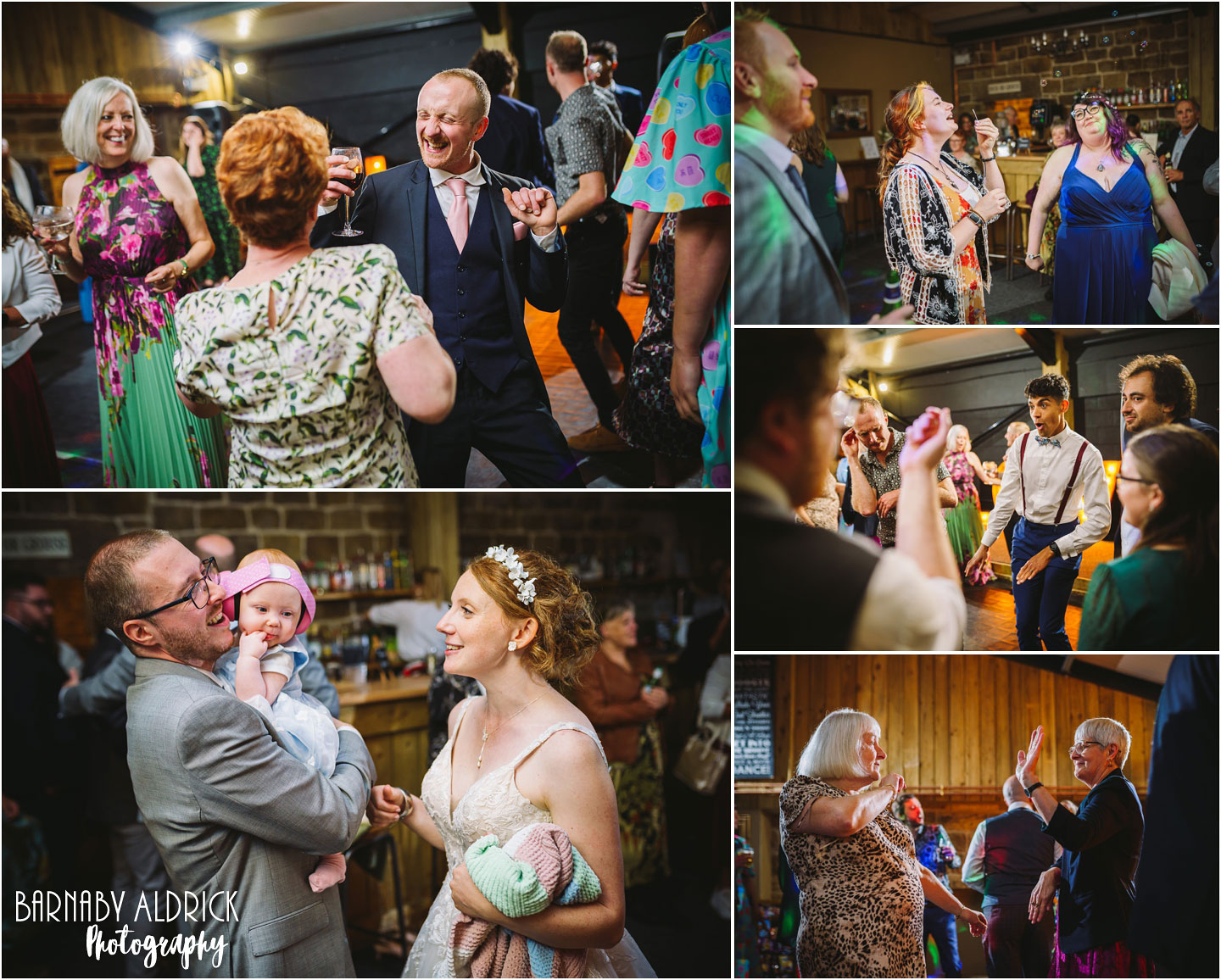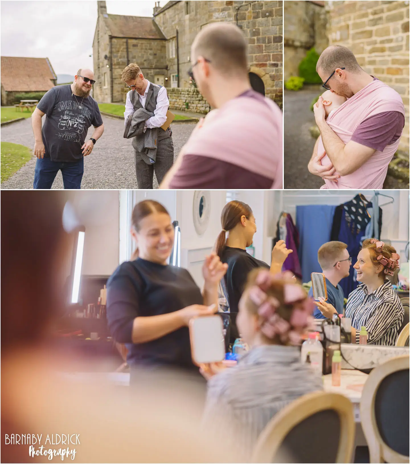 In the morning I skipped between the bridefolk (with a gent of honour) in the house and groomsfolk (also starring a lady person of honour) in the Threshing Barn – and very much enjoyed the banter at each! Their ceremony upstairs in The Courtroom was super charming, literally passing the baby to pop rings on one another, before processing out to a string rendition of the Jurassic Park theme!