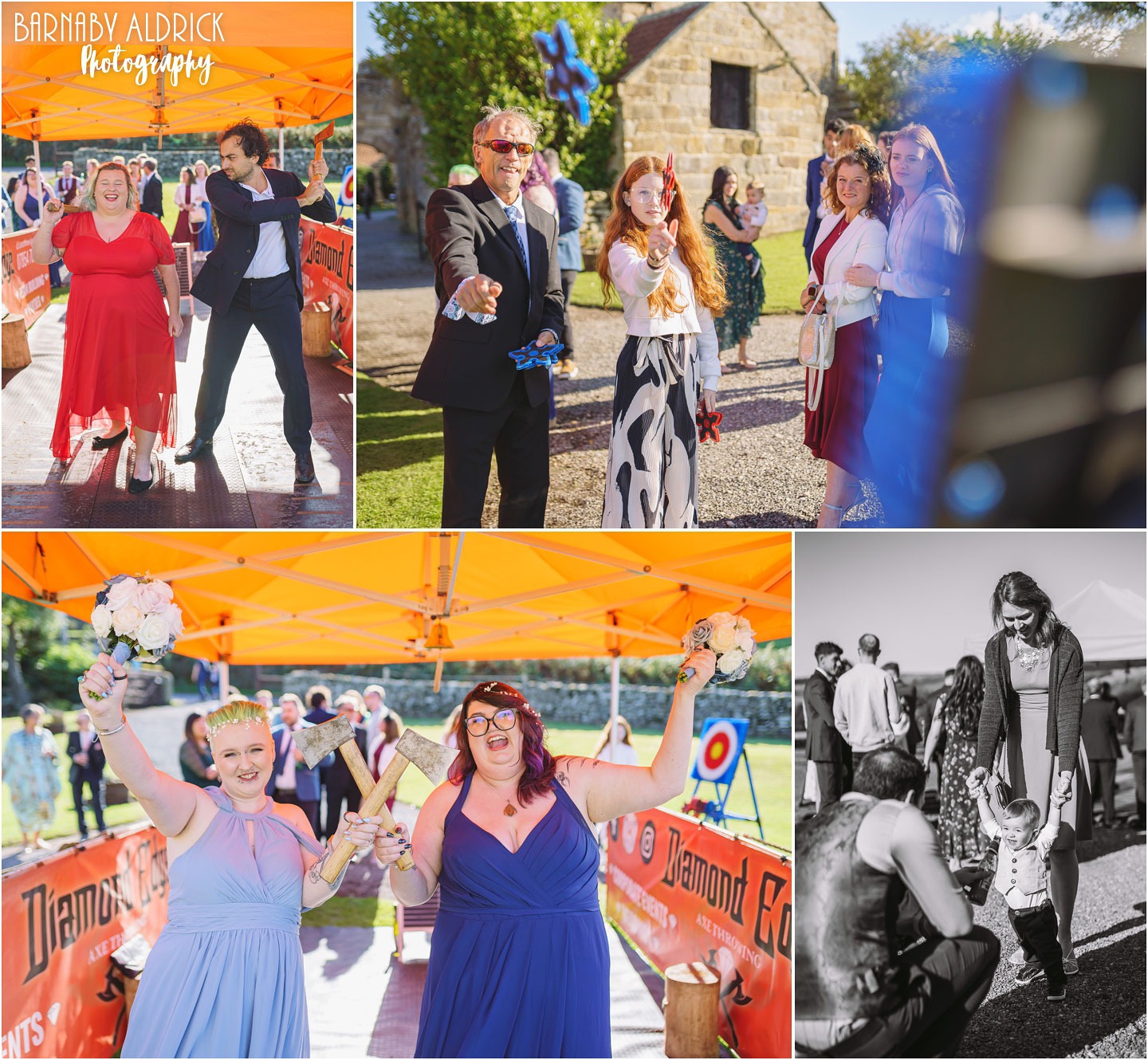 Venue: Danby Castle Barn (@danbycastlebarn) | Hair & Makeup: Makeup by Amy Nellis (@madeleine_makeupstudio) | Florist: DIY Silk Flowers | Music/Entertainment: Northern Lights Quartet | Axe Throwing (@diamondedgeaxethrowing)