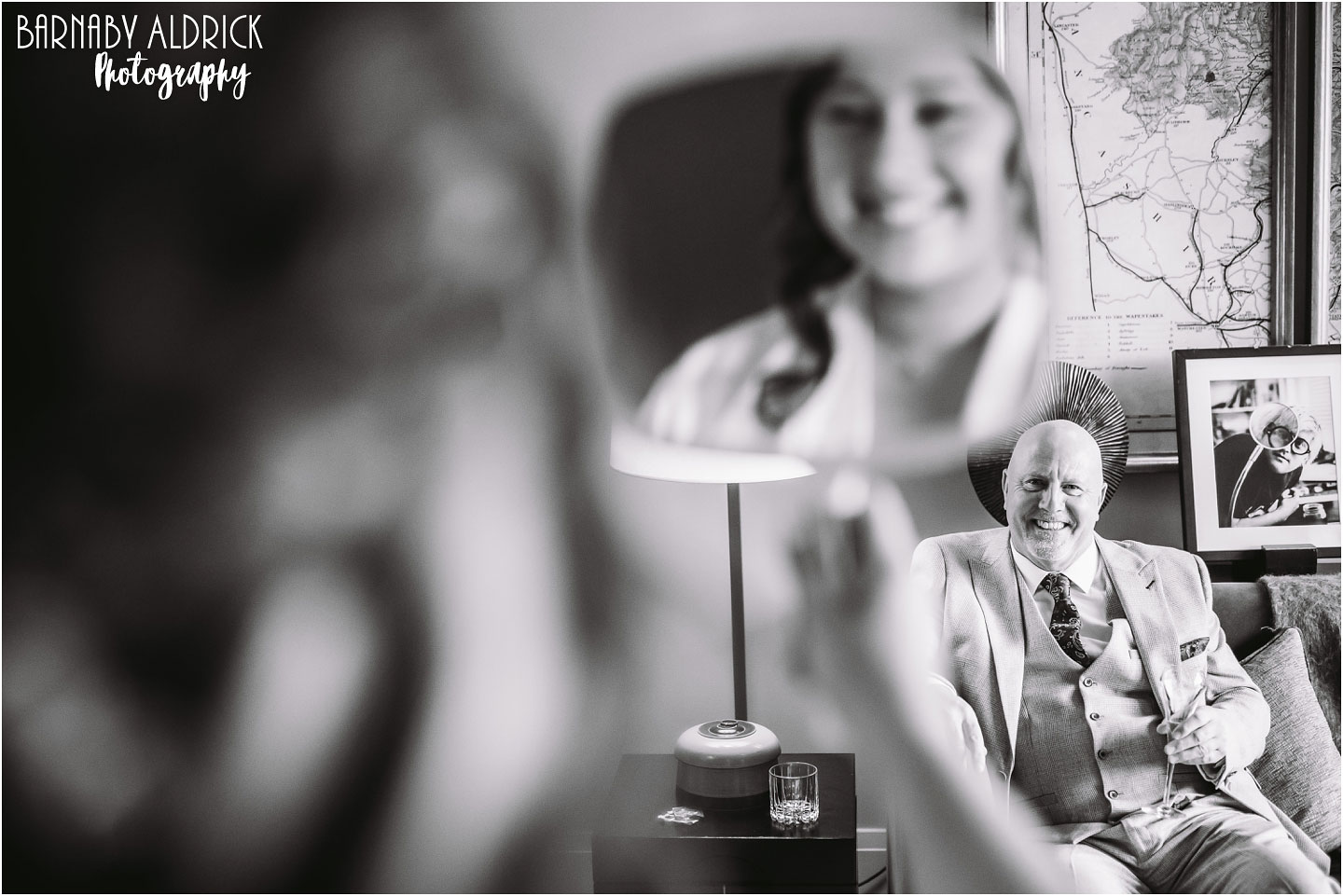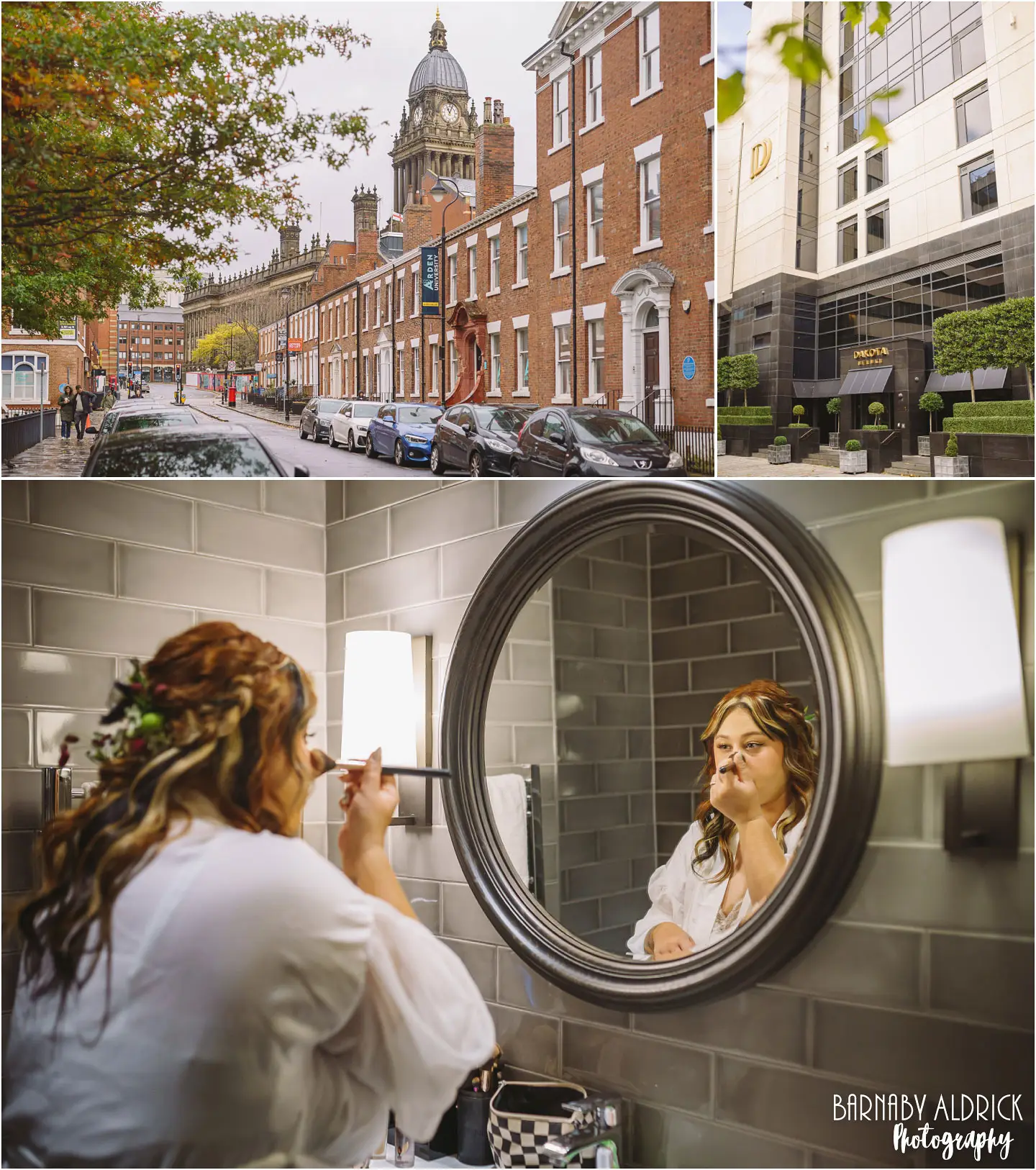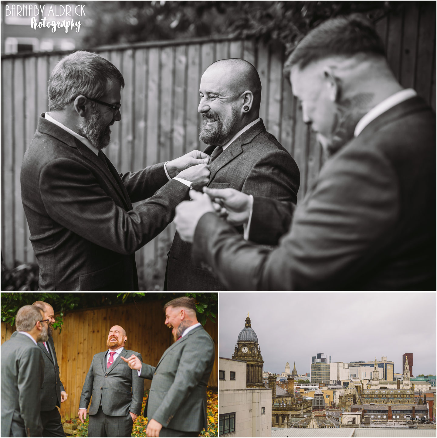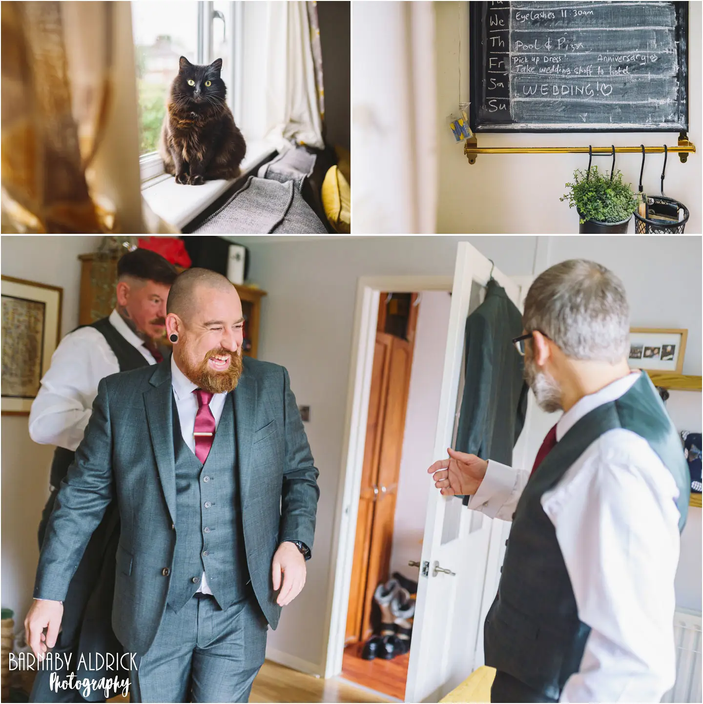 I kicked off morning preps with a fun Team Groom, in drizzly Horsforth with their cats Ozzy and Sharon. Then I zoomed into town to join Team Bride in a grand suite on the 9th floor of the swanky Dakota hotel in central Leeds.
