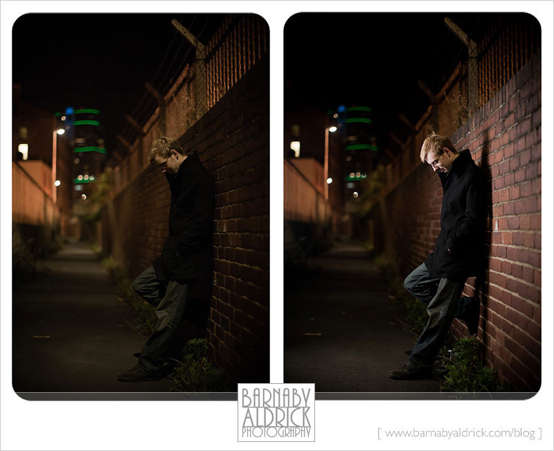 We found this cool (ready ‘shady’) alley, and with fellow snapper Aiden Dunbar to stand in as model, I got James to pop the flash off an opposite wall, casting a wicked soft light.