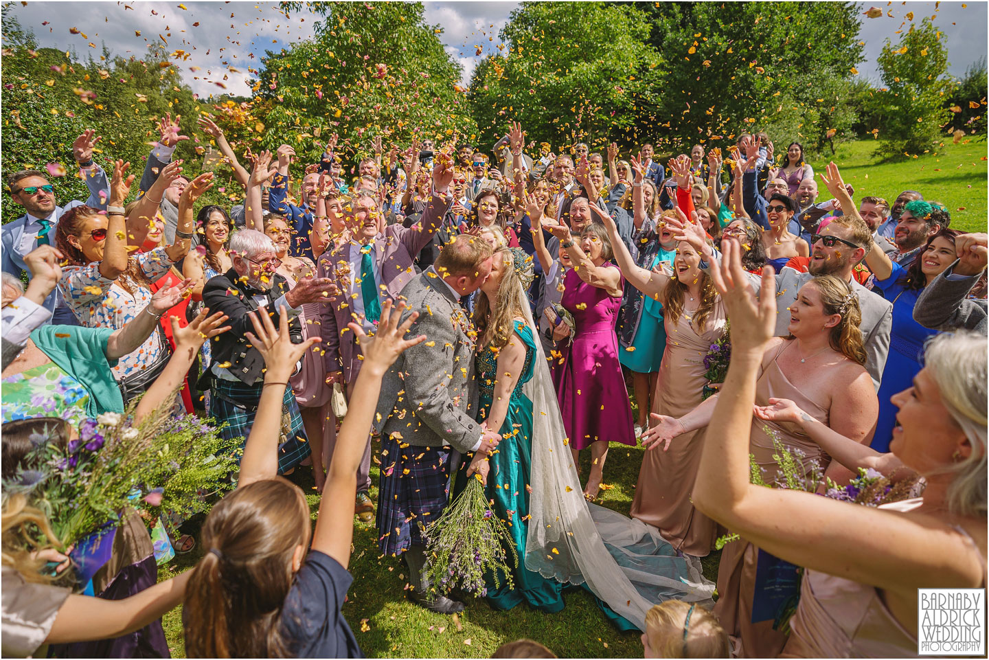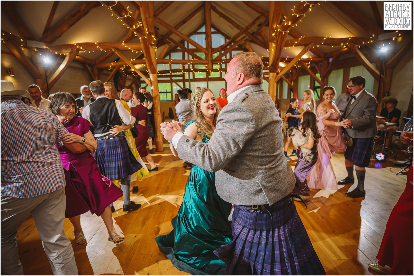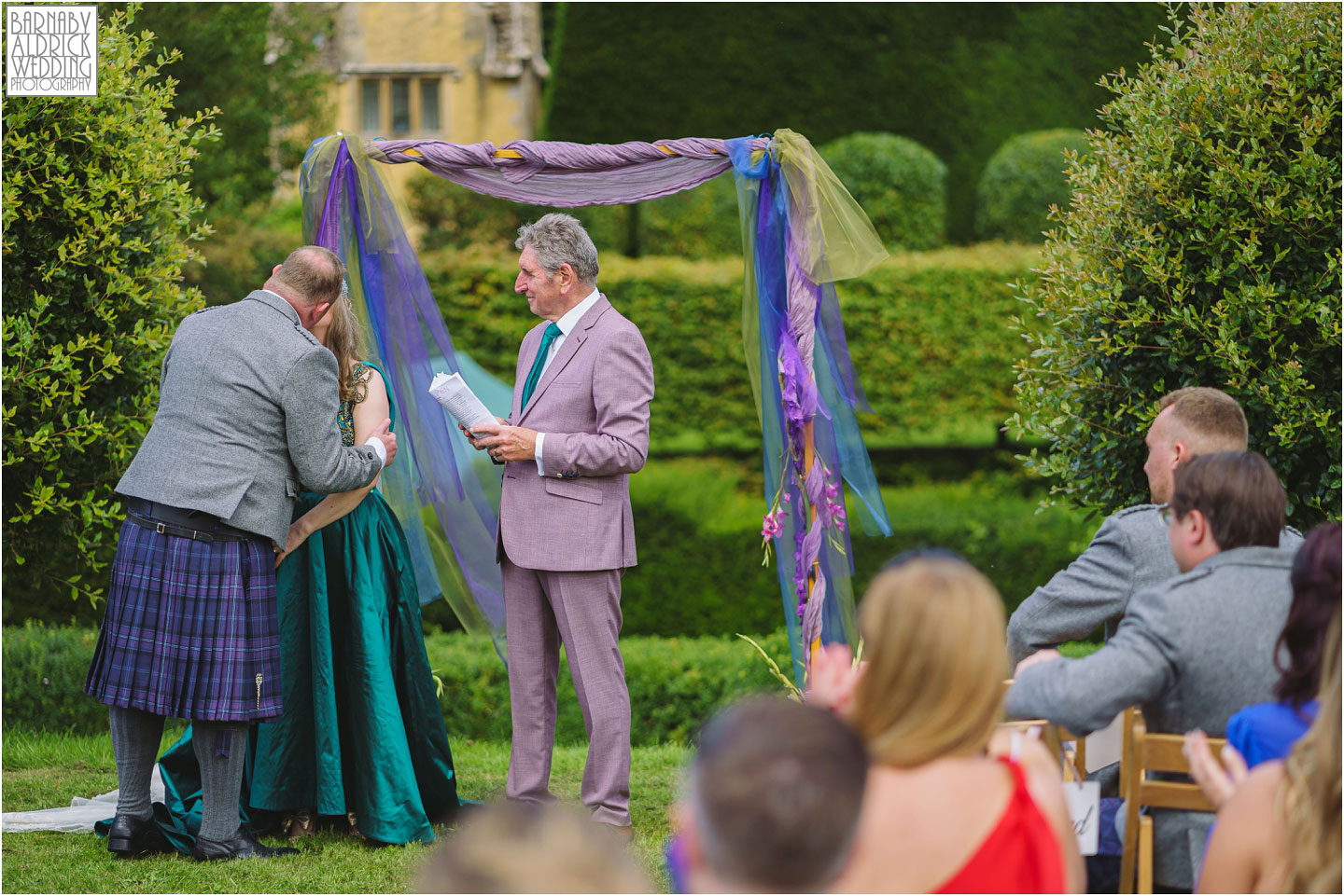 I knew it’d be a unique, fun-packed day, and it didn’t disappoint! Not only had Caroline commissioned an amazing handmade teal 3 part dress (with a removable lower-half for evening dancing!), but she’d hand-made the flower girls dresses and made the wild-flower bouquets! After an hour with the 8 strong bridal party in the Cyder Barn (built in 1446 no less!), I slipped over to Jimmy & the gents in Manor Farm Cottage for their kilting up into traditional Scottish Thistle tartan! There’s barely a photo without a beer in hand or a wee dram, and spirits were high!